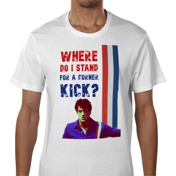 Celebrate cult football film magic with this officially styled Escape to Victory Hatch Corner Kick T-Shirt – featuring the iconic “Where do I stand for a corner kick?” quote from Sylvester Stallone’s unforgettable character. Perfect for football fans, vintage movie lovers & anyone who loves mixing humour with classic sport culture. Made from soft, 100% cotton and printed in full colour, it’s a standout everyday tee that sparks conversation and nostalgia.