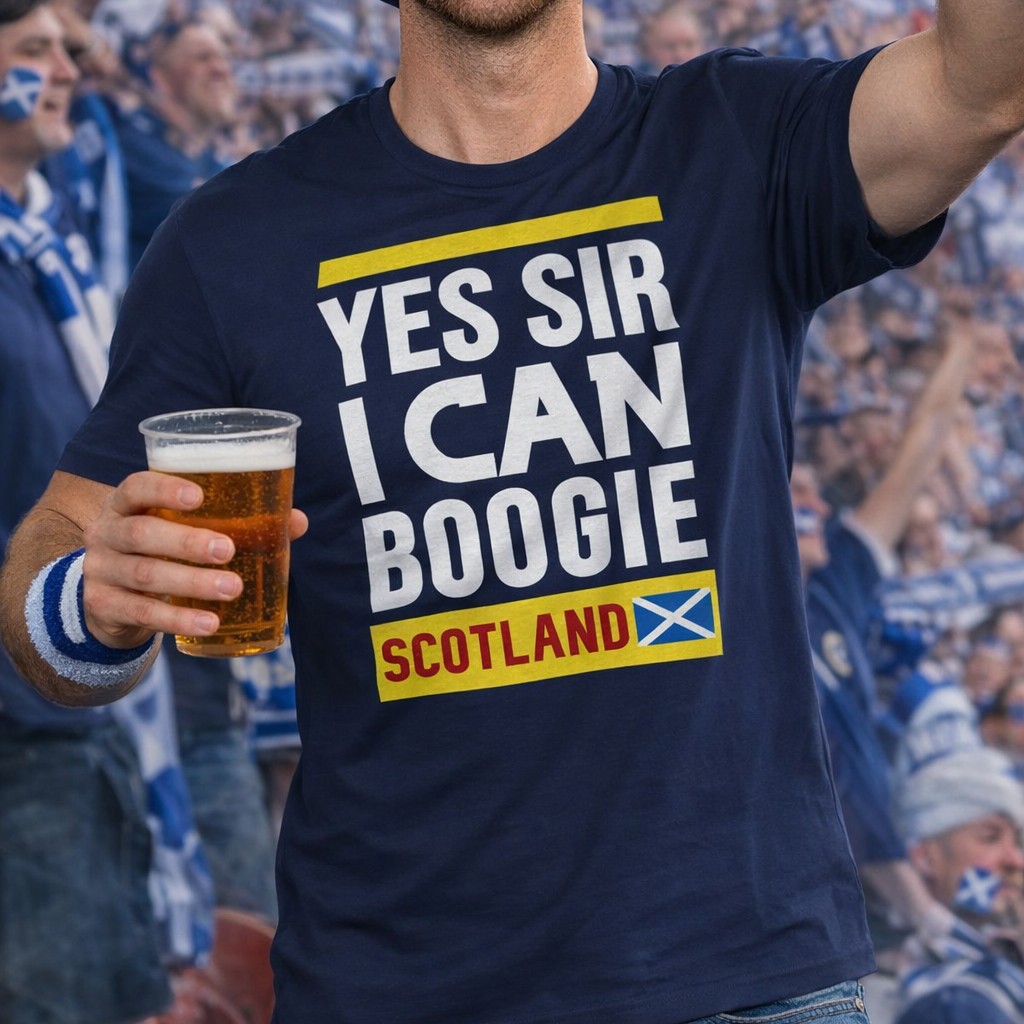 Introducing the ultimate statement piece for every football fan and music lover alike: the "Scotland Yes Sir I Can Boogie Blue T-shirt"! This vibrant blue tee is not just a shirt; it's a celebration of Scottish pride and a nod to the iconic anthem that gets everyone on their feet.