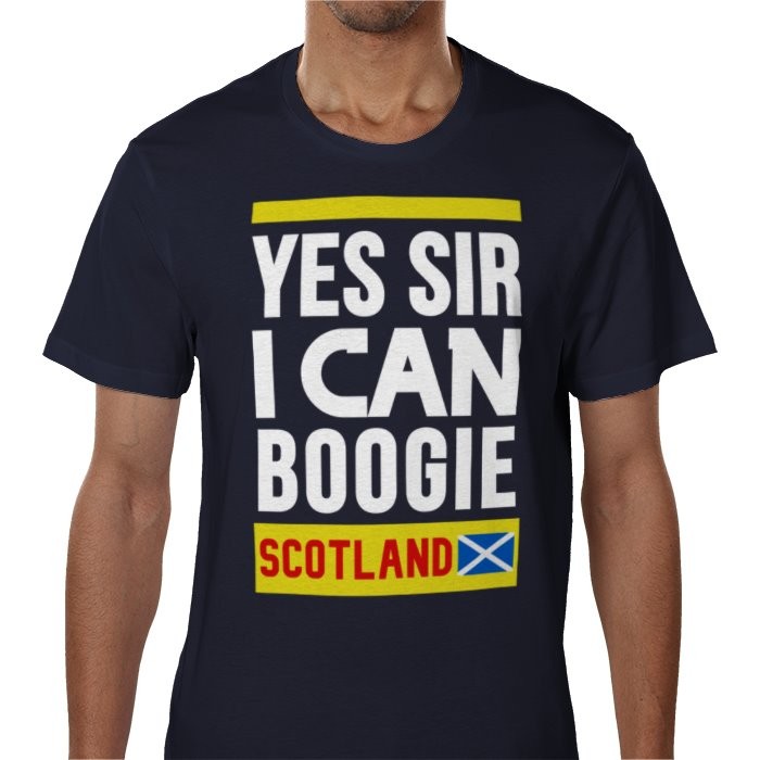 Featuring a bold and eye-catching print that proudly displays "Scotland Yes Sir I Can Boogie," this shirt is designed to turn heads and spark conversations. The playful typography adds a fun twist, making it a must-have for anyone who loves to express their personality through fashion.