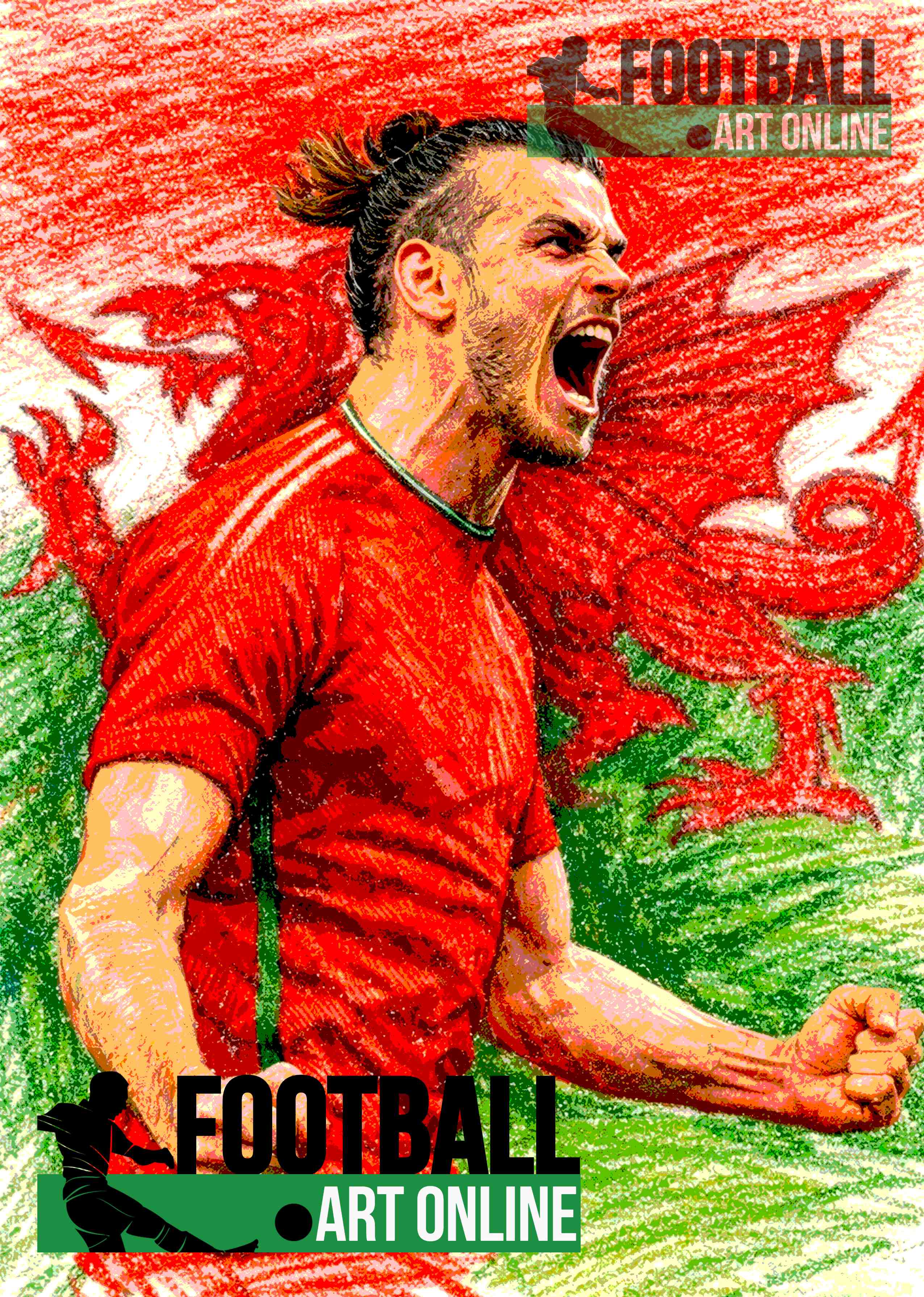 Whether you're a die-hard supporter of the Welsh national team or simply admire Bale's incredible talent and contributions to the sport, this print is sure to resonate with you. The artwork features a dynamic portrayal of Bale in action, showcasing his signature style and passion for the game. The bold colours and striking design make it a standout piece that will grab attention and spark conversations.